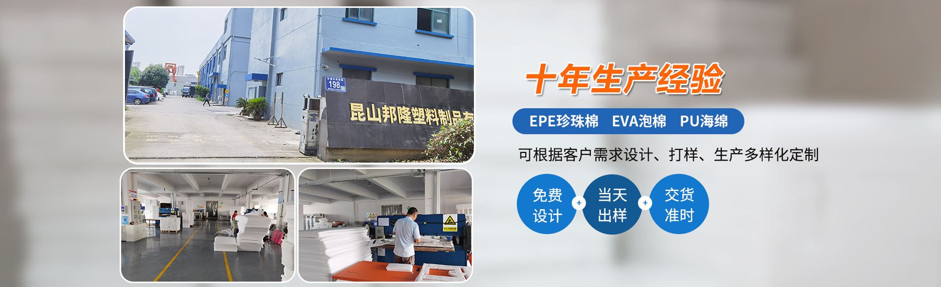 昆山邦隆塑料制品有限公司成立于2010年3月,坐落于長三角地區江蘇省昆山市。是一家集設計、生產、銷售為一體的生產型企業。占地面積3000多平方米,本公司專業生產各類珍珠棉片材、卷材、異型材、護角、EVA泡棉、PU海綿等。 我們的產品在電子、塑膠、五金、機械、儀表、食品、水產、玩具、醫藥、立體倉儲等各行各業得到廣泛應用,是倉儲物流的優選緩沖材料。
